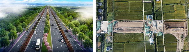 東環(huán)路南延二期項目效果圖(左)與現場俯瞰圖(右)